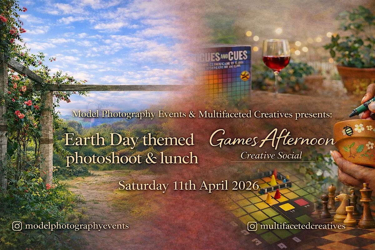 Join from 11am for a dual location Earth day themed group shoot workshop for photographers, £50 and includes shooting with pro models for 4 hours! After from 3pm there will be a lunch and drinks session for all with board games including cards, hues & cues colour game, and chess. The social is free to attend, details below!