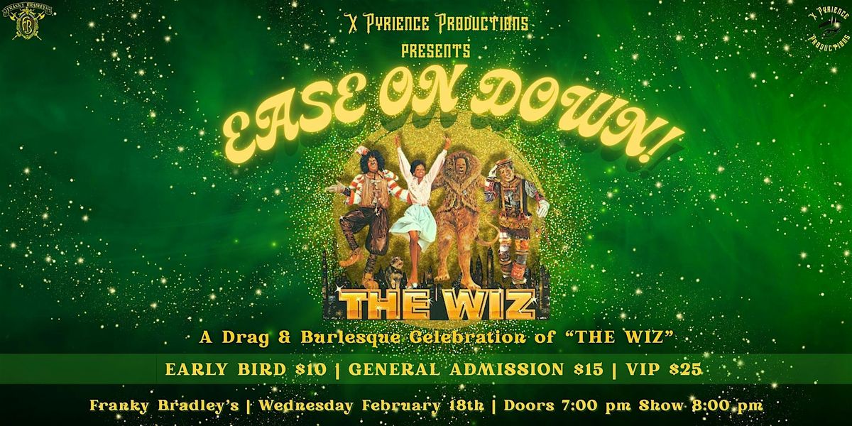 Get ready for a night of Black Excellence as we celebrate the cultural phenomenon, The Wiz! Join X Pyrience Productions at Franky Bradley's for a magical evening filled with dazzling drag & burlesque performances, amazing raffle prizes, delicious specialty drinks, and a costume contest; all inspired by the beloved & iconic movie musical. Let this star-studded cast take you on a journey down the yellow brick road on February 18th like you've never experienced before!