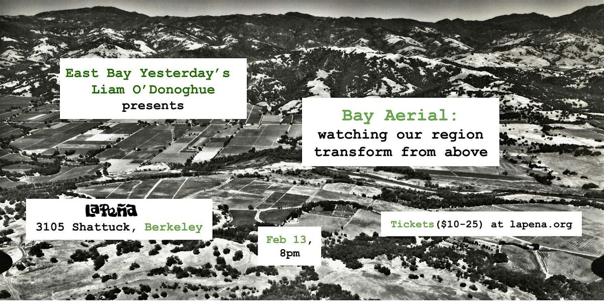 What does looking at half a century of aerial photographs reveal about the Bay Area’s ongoing transformation? East Bay Yesterday host Liam O’Donoghue will explore this question by closely examining a mysterious archive of images he rescued from destruction. These photos show much more than changing landscapes – they illustrate the values, circuitry, and impact of our civilization, for better or worse.
