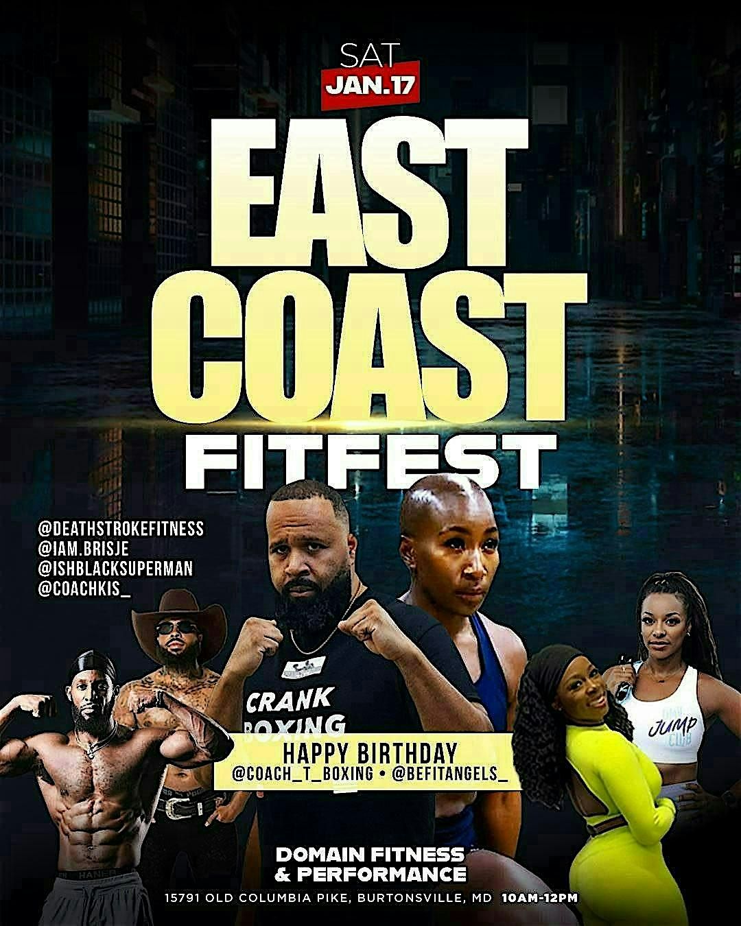 Get ready to move, sweat, and connect at the coolest in-person fitness bash on the East Coast! Featuring some of the hottest Fitness Professionals Death Stroke (NC) Be Fit Angel (MD) Coach Kis (MD) Coach T (DC) Iam Brisje (MD) Ish Black Superman (VA)