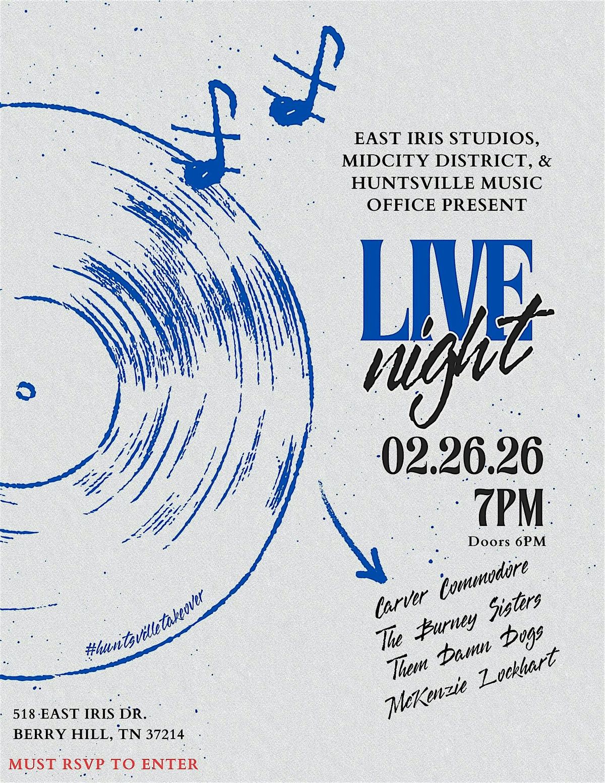 Get ready for an epic night at East Iris Studios! We're bringing you Huntsville Invasion LIVE NIGHT, an unforgettable in-person event packed with energy, fun, and surprises. Come hang out, experience the vibe up close, and make memories with friends. Don’t miss out on this cool night!
