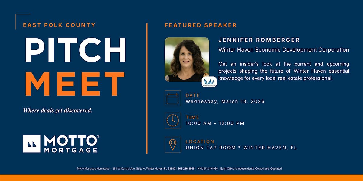Join us for the launch of our Local Expert Speaker Series, hosted by | Motto Mortgage Homewise, Winter Haven, where we're bringing you the most valuable voices in our community to help you elevate your business and better serve your clients. Our first featured speaker is Jennifer Romberger from the Winter Haven Economic Development Corporation (WHEDC), an organization uniquely positioned at the intersection of public and private sector growth, working every day to build a resilient, inclusive, and equitable economy right here in Winter Haven. Jennifer will be sharing an insider's look at the exciting projects currently underway in our area, as well as the developments on the horizon that will shape Winter Haven's future, giving real estate professionals exactly the kind of local knowledge that turns a good agent into a trusted community expert. When you know what's coming before your clients do, you're not just selling homes, you're guiding people into a future you can already see.