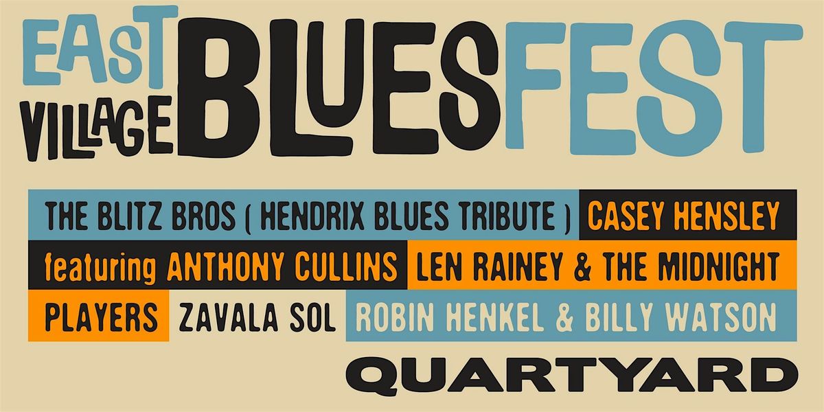 The 5th Annual East Village Blues Fest on Sat June 13th 4-9 PM at Quartyard featuring Robin Henkel & Billy Watson, Casey Hensley featuring Anthony Cullins, Len Rainey & The Midnight Players, Zavala Sol & The Blitz Bros performing the Blues of Jimi Hendrix!!