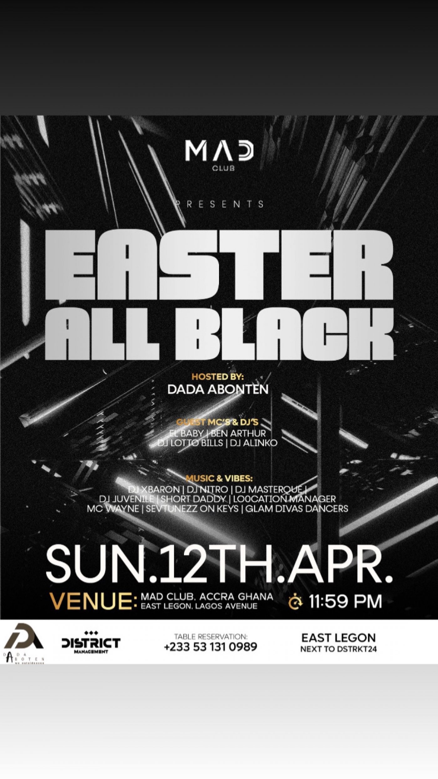 The countdown begins! 🎉 My birthday goes ALL BLACK at Mad Club, East Legon this Easter Sunday, 12th April 🔥. Dada Abonten & crew bringing the HYPE! 💥 ALL BLACK dress code, free flow drinks, top DJs & MCs! 😎 +233 53 131 0989 #EasterAllBlack #AllBlackParty #MadClub #DadaAbonten #BirthdayBash #AccraNightlife 💃🕺