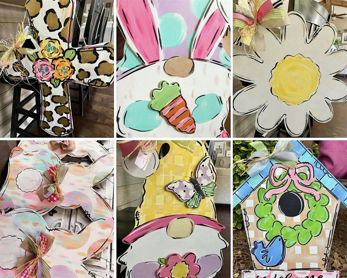 Celebrate the season with a fun and creative evening painting 2 foot tall wooden door hangers that are perfect for welcoming spring into your home.