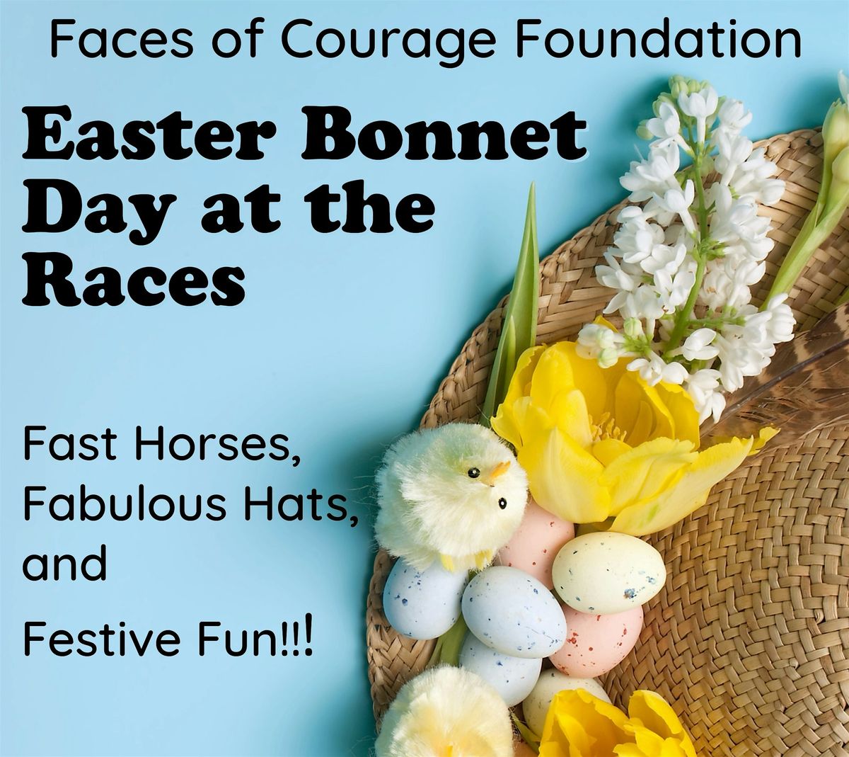 So, rally your friends, pile on the feathers, easter eggs, and flowers, and join us for a day of hats, horses, and hope. Every ticket sold and every bonnet entered helps Faces of Courage continue providing free camps, outings, and support for cancer survivors. Bring your friends and be part of something unforgettable!