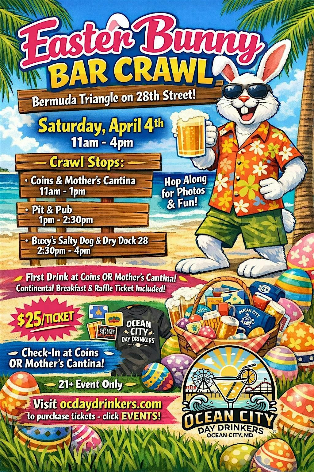 First drink at Coins OR Mother's Cantina, continental breakfast (at either location as you check-in) & raffle ticket for a chance to win the basket of swag/gift cards from participating venues & Ocean City Day Drinkers apparel included with ticket purchase.