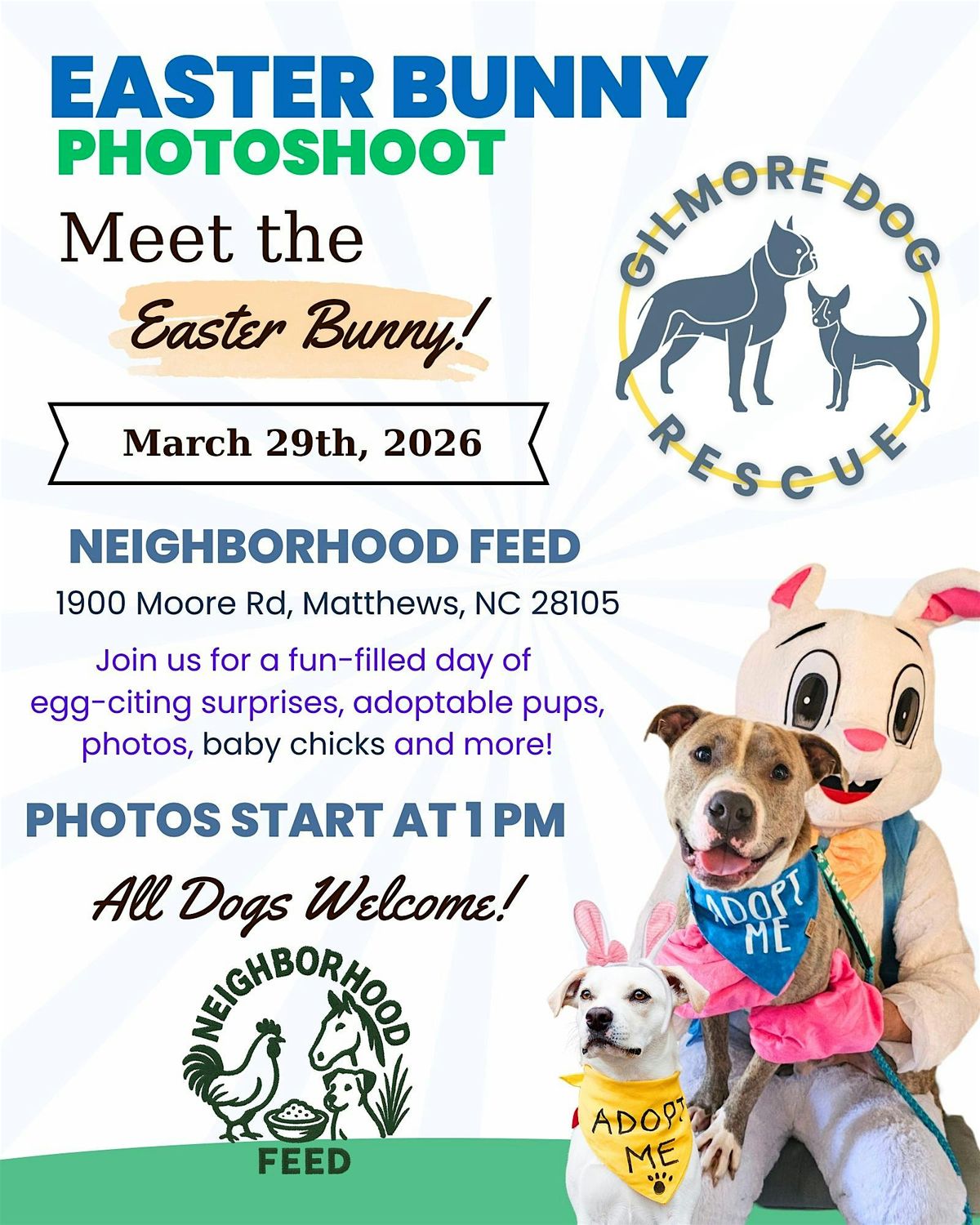 Help raise money for the pups are Gilmore Dog Rescue! Meet baby chickens, adoptable pups and the Easter bunny!!