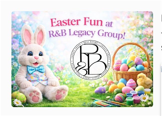 The Easter Bunny is hopping into the R&B Legacy Group office! Weāre inviting agents to bring their familiesāor invite clients and their familiesāfor a fun, kid-friendly Easter event. Enjoy photos with the Easter Bunny, plus a cute craft activity for the kids right here in the office.