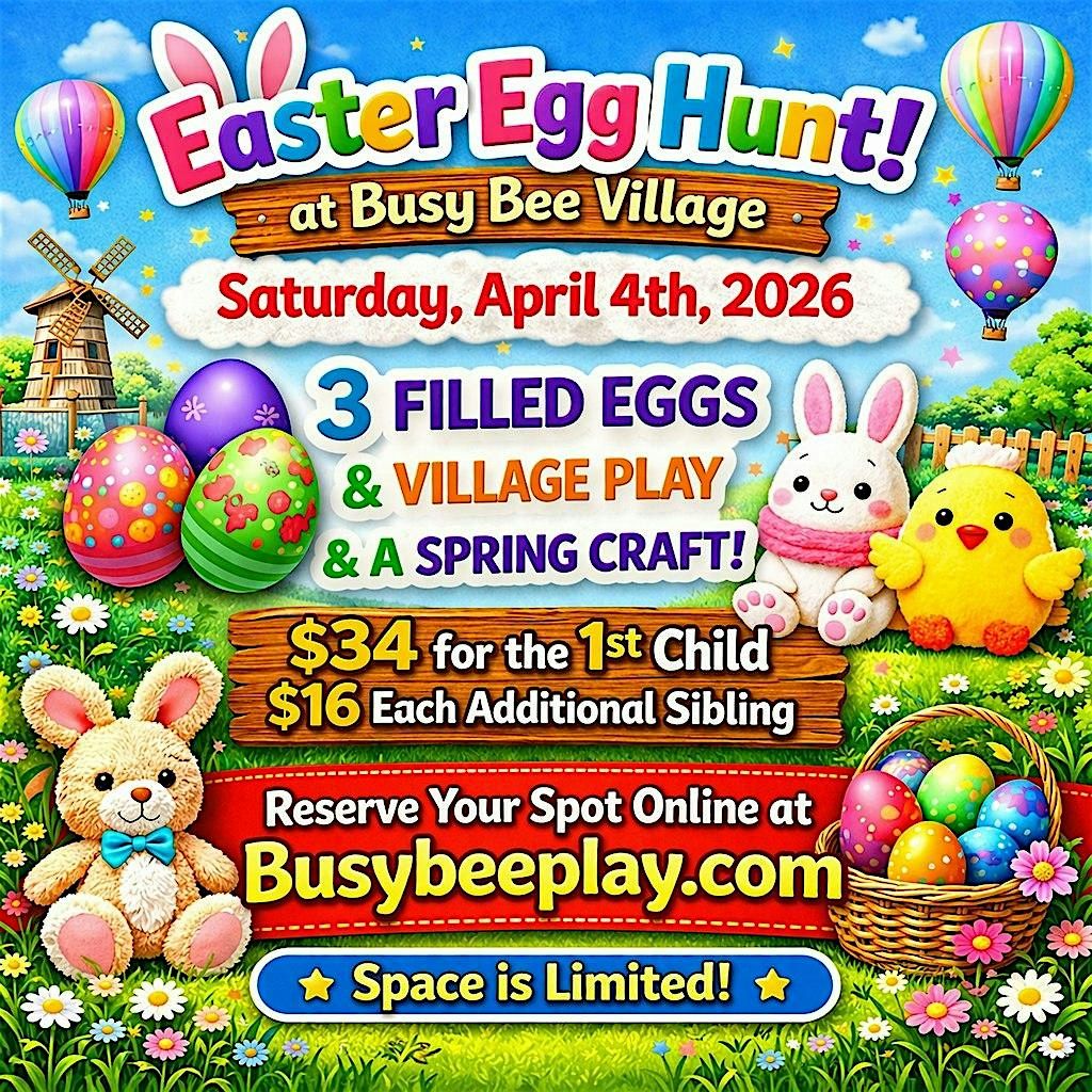 Get ready for some egg-citement at the Easter Egg Hunt! Join us in person at Busy Bee Village for a fun-filled play session including: hunting colorful eggs, playing with new friends, and participating in a spring craft! Bring your smiles—this is one event you won't wanna miss. Perfect for children 1 - 9. See you there!