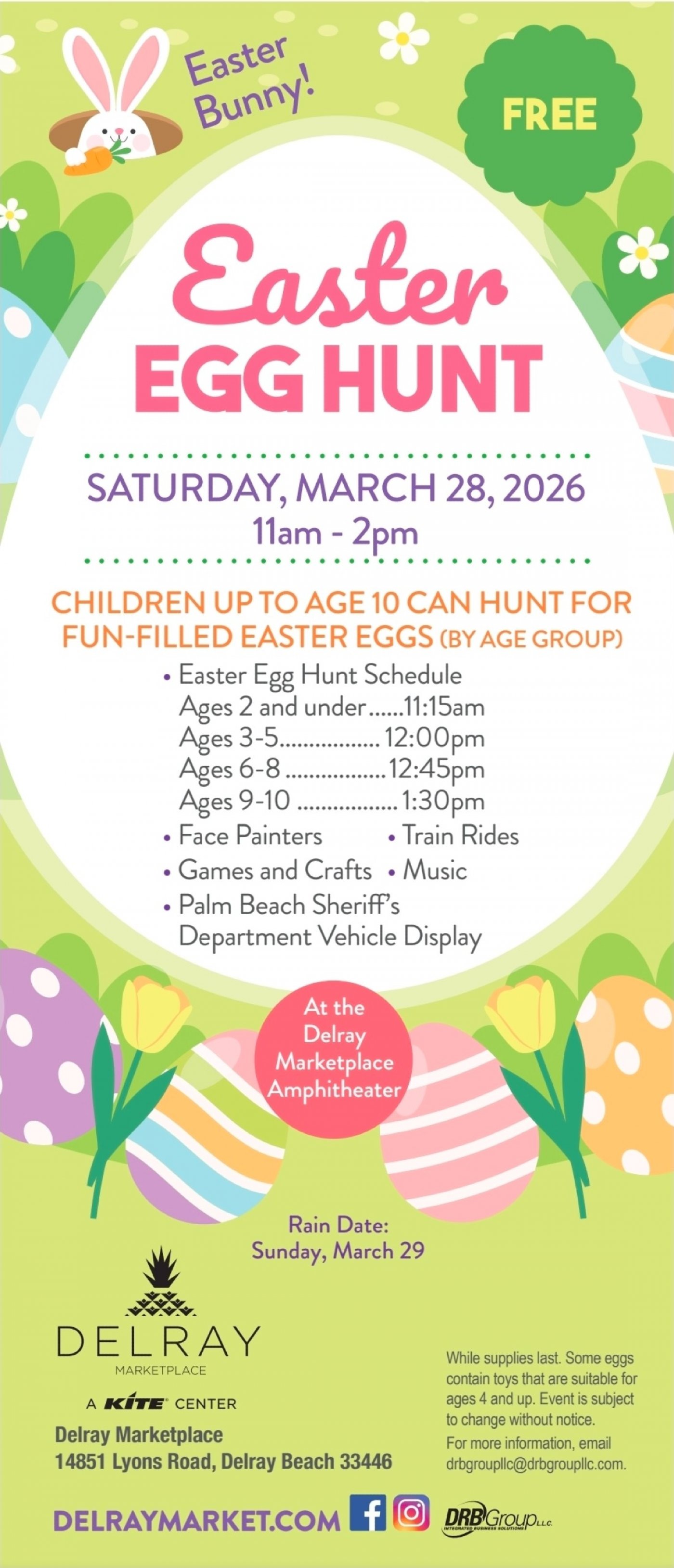 Come on down and enjoy the Easter Event happening at the Delray Marketplace! Children will have an opportunity to participate in one of four age specific egg hunts. And don’t forget to meet and take photos with our special guest… The Easter Bunny! Families will also enjoy the variety of fun activities offered such as a trackless train ride, face painting, crafts, refreshments and more!