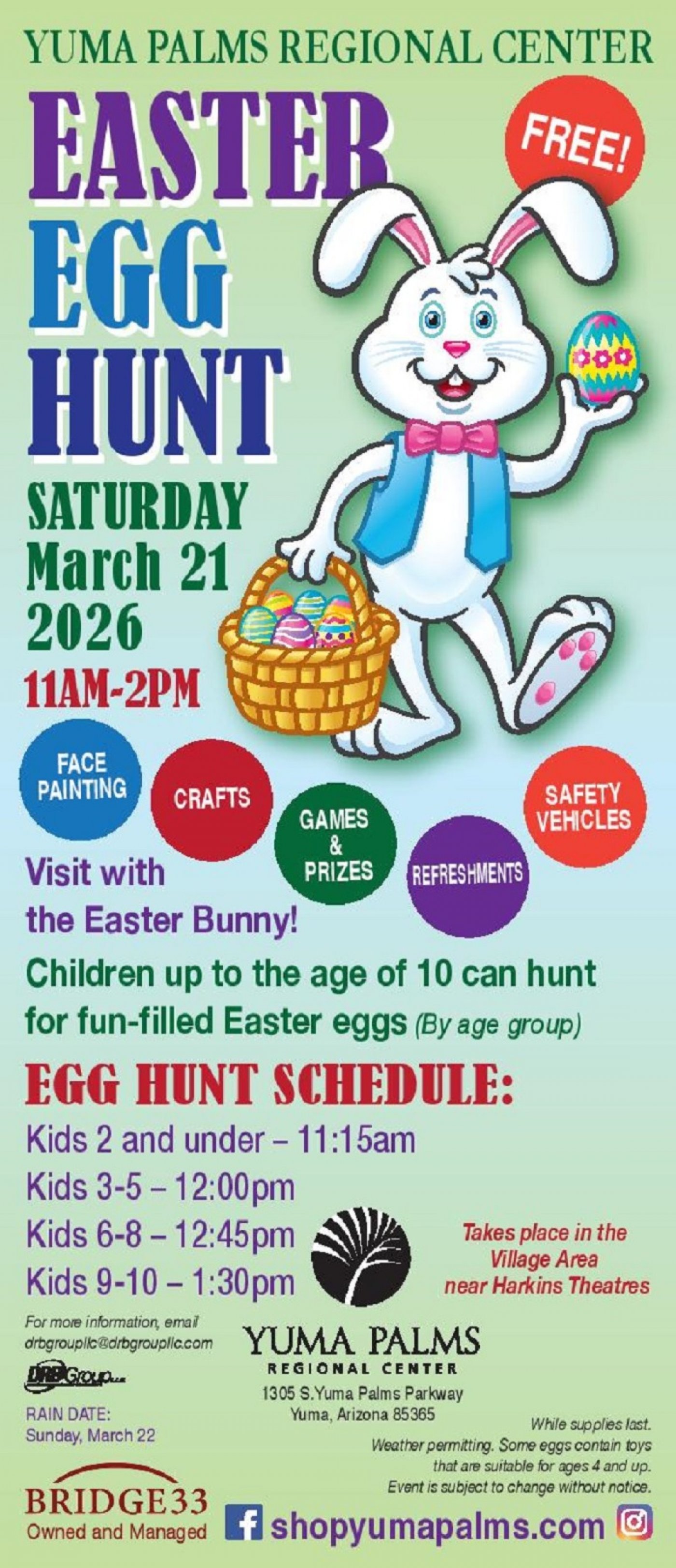 The Yuma Palms Regional Center located at 1305 S. Yuma Palms Parkway is hosting a free Easter Egg Hunt on Saturday, March 21st, from 11am-2pm.