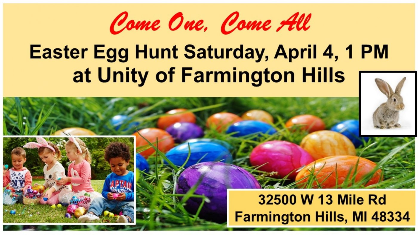 Free Easter Egg Hunt Event at Unity of Farmington Hills on Saturday, April 4th at 1:00pm. Please arrive early. Pictures with the Easter Bunny and lots of goodies hidden in the eggs. We look forward to seeing you there.
