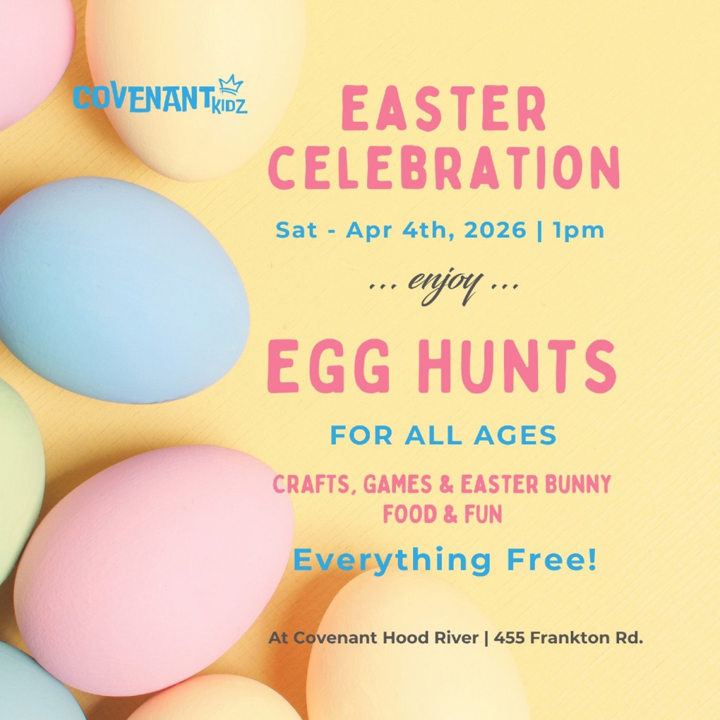 Join us for an afternoon of Easter fun! We will have singing, dancing, crafts, and food followed by easter egg hunts for all ages (including gift card prizes for the 13-adult hunt). Say hi to the Easter Bunny and check out the gifts in his basket, he makes a special appearance every year!