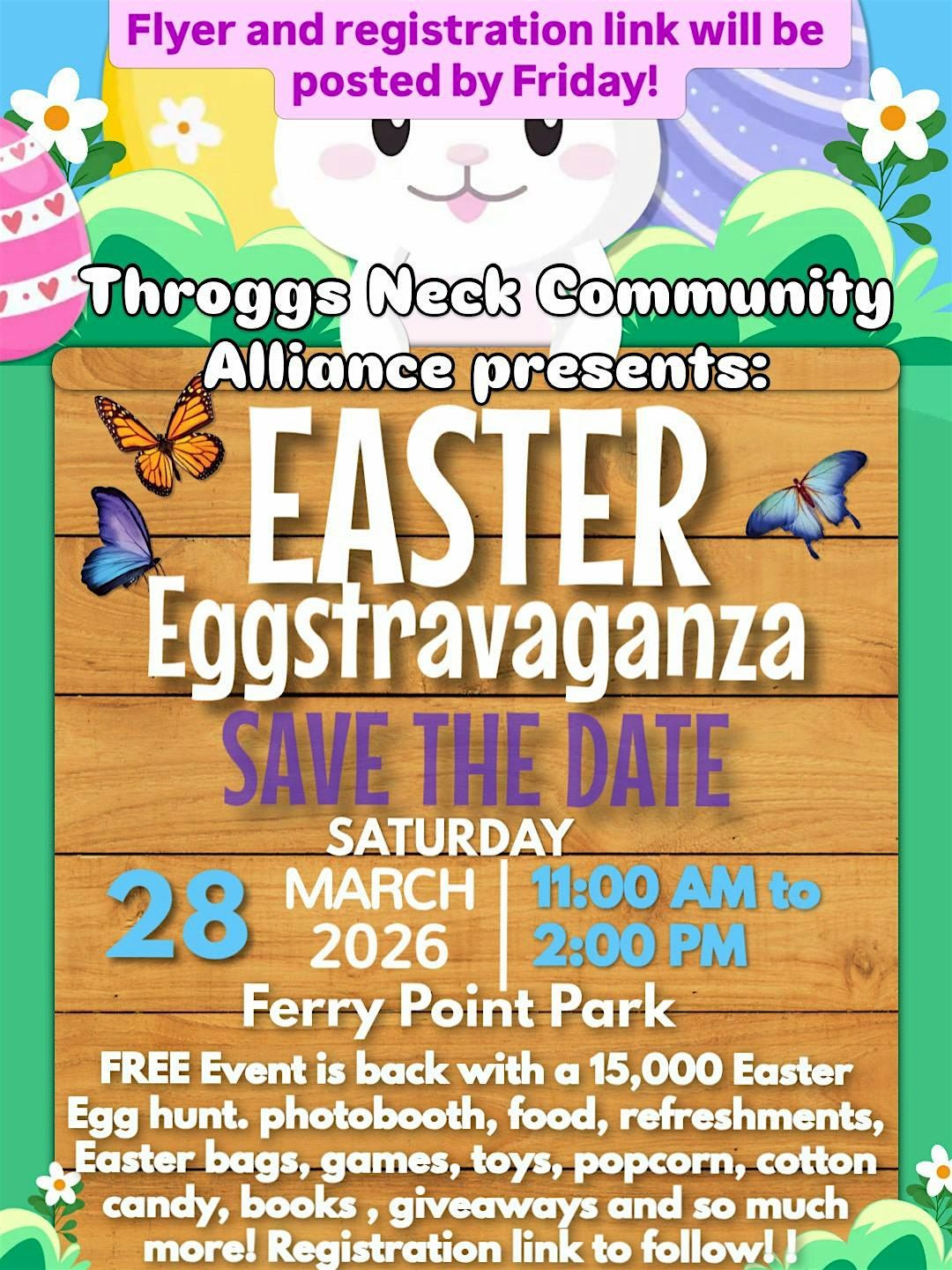 This event requires that each attendee must register online and registration will fill up quickly. This is a fun , free event for people of all ages. The egg hunt time will be officially announced. Kids will be given Easter egg baskets/bags upon entrance and it is one bag per child. Everything is provided while it lasts. This includes toys, food, books, etc. Follow our website for more information at : www.throggsneckcommunityalliance.org