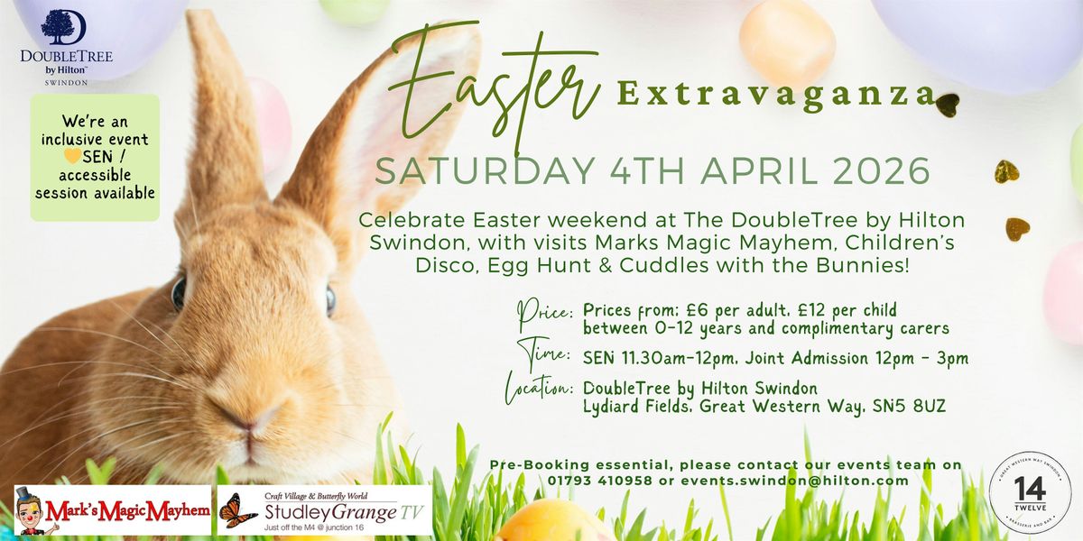 Our Easter Extravaganza at the DoubleTree by Hilton Swindon is bursting with entertainment for the whole family from Mark’s Magic Mayhem and a lively kids’ disco to visits from the Easter Bunny, plus the chance to meet-and-cuddle real bunnies & chicks.