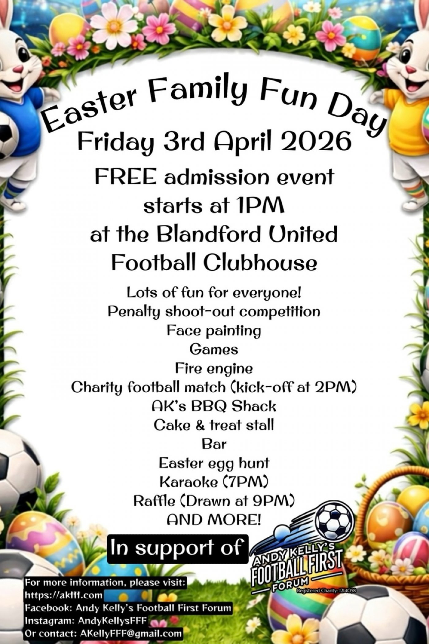 From 1PM, there will be DJ entertainment, a penalty shoot-out competition, face painting, and games. The bar will be open throughout the day. A fire engine visit is expected, subject to change due to emergency service requirements. Our charity football match will kick off at 2PM. Feeling hungry? We’ll have AK’s BBQ Shack along with a cake and treat stall available. Following the football match, children aged 10 and under can take part in an Easter egg hunt, with chocolate Easter eggs awarded to the winners. Karaoke will begin at 7PM, and our raffle will be drawn at 9PM. This is just the start of the fun, so join us to enjoy a full day of activities for people of all ages.