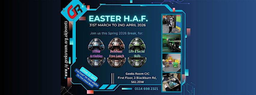 Register your interest, and we'll be in touch with booking information or you can book directly through our website here: https://sy.geeksroom.org.uk/event-details/geeks-room-south-yorkshires-easter-h-a-f-event-2026