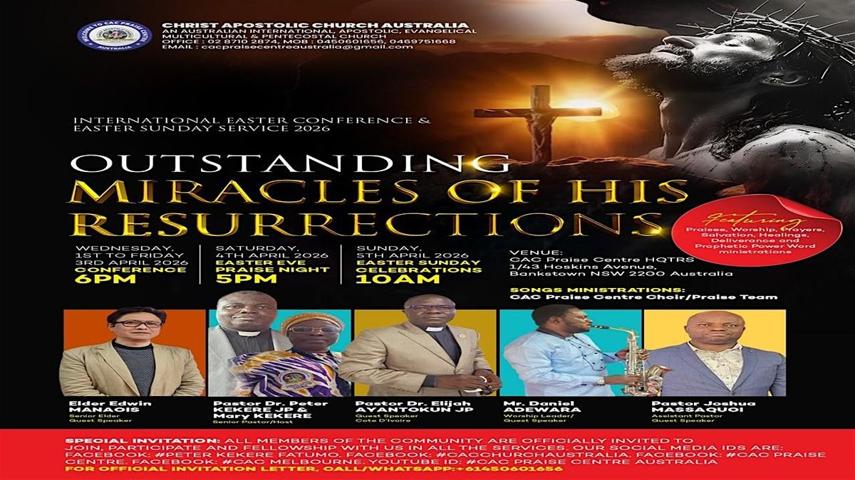 Description of the Event: The Easter International Conference 2026, organised by Christ Apostolic Church Praise Centre Inc, is an international gathering that warmly welcomes all saints, churches, children of God, Bible scholars, students from every level of education, family members, individuals, pastors, and church leaders from every state and territory in Australia, as well as from across the world. The conference is dedicated to the spiritual and cultural development, growth, and profound biblical enrichment of all participants, focusing on the Outstanding Miracles of the Resurrections of Christ. It is designed as a platform for learning, unity, and shared experience among believers and seekers alike.