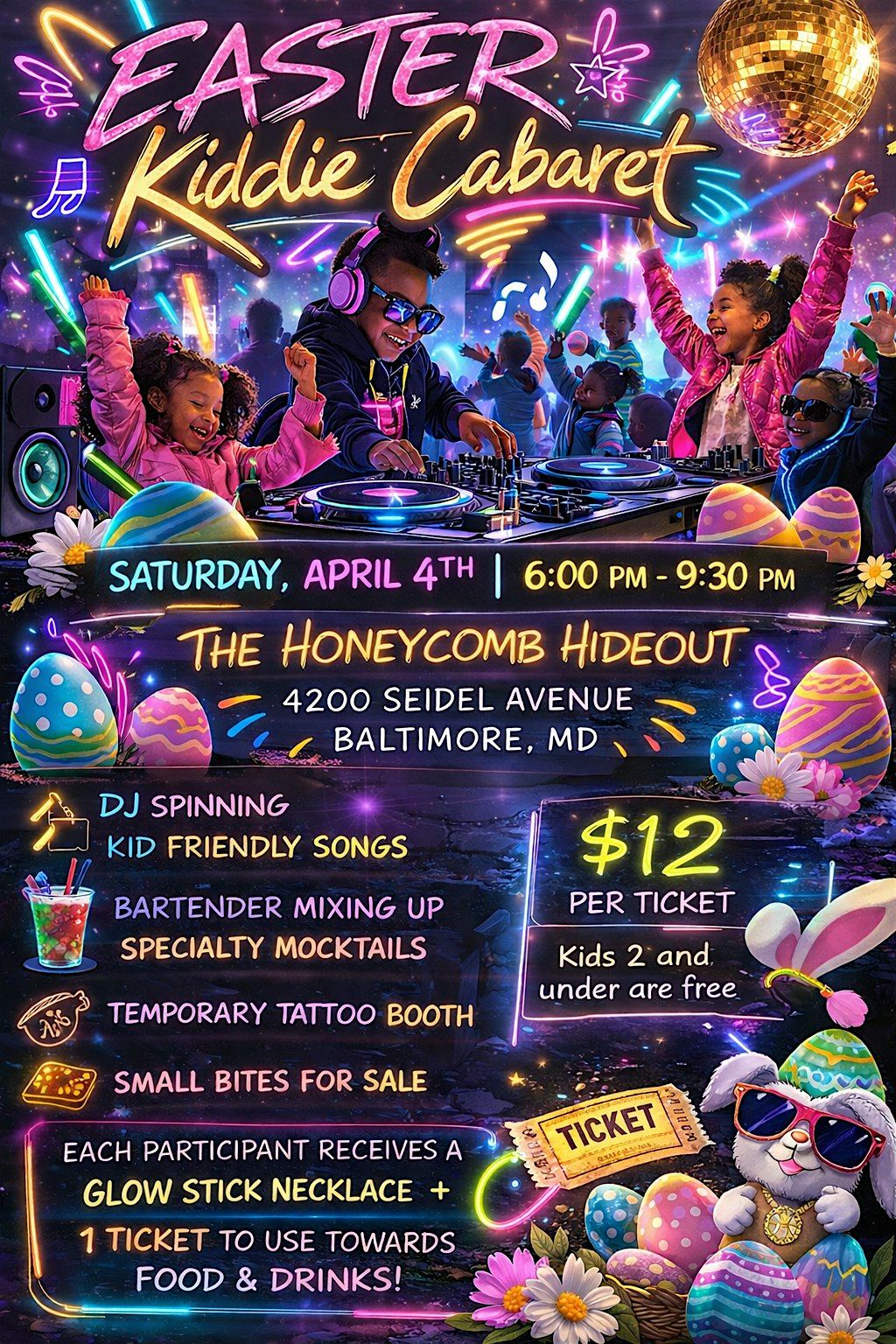 Admission includes a glow item at check-in and one mocktail ticket to redeem at our specialty mocktail bar. Kids will enjoy a high-energy dance party with a live DJ playing their favorite kid-friendly songs. The event also features a temporary tattoo station and light snacks available for purchase to keep everyone fueled and having fun.