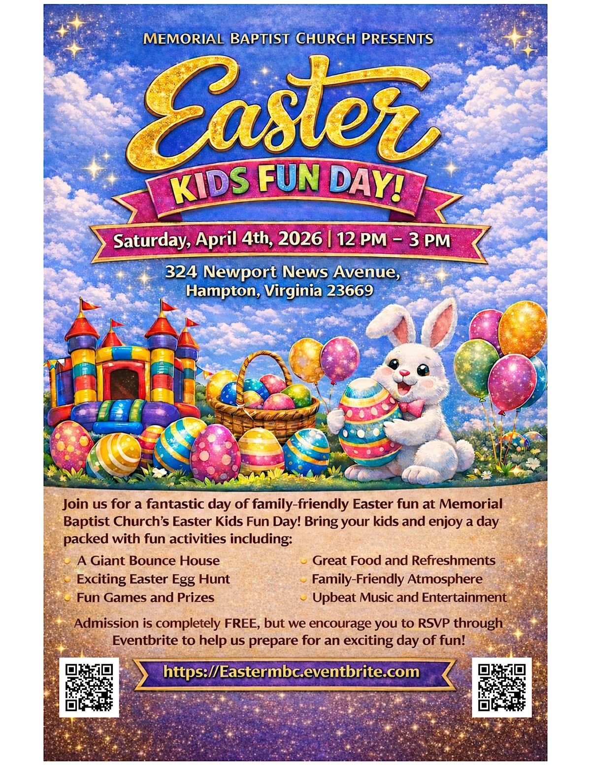 Memorial Baptist Church invites you and your family to an unforgettable day of fun at our Easter Kids Fun Day! 🎉🐰