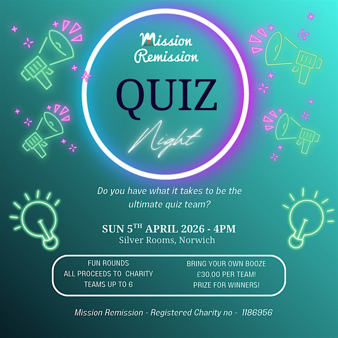 Get ready for some fun and brain-teasing challenges at our in-person Easter Mission Quiz with all proceeds going direct to Mission Remission Cancer Support charity. Come along, meet new friends, and put your knowledge to the test in a relaxed and friendly atmosphere. Whether you’re a quiz pro or just in it for the laughs, this event is perfect for everyone. Cheap evening out, Bring your own booze /nibbles and it's Bank holiday monday the next day!! - BONUS!!