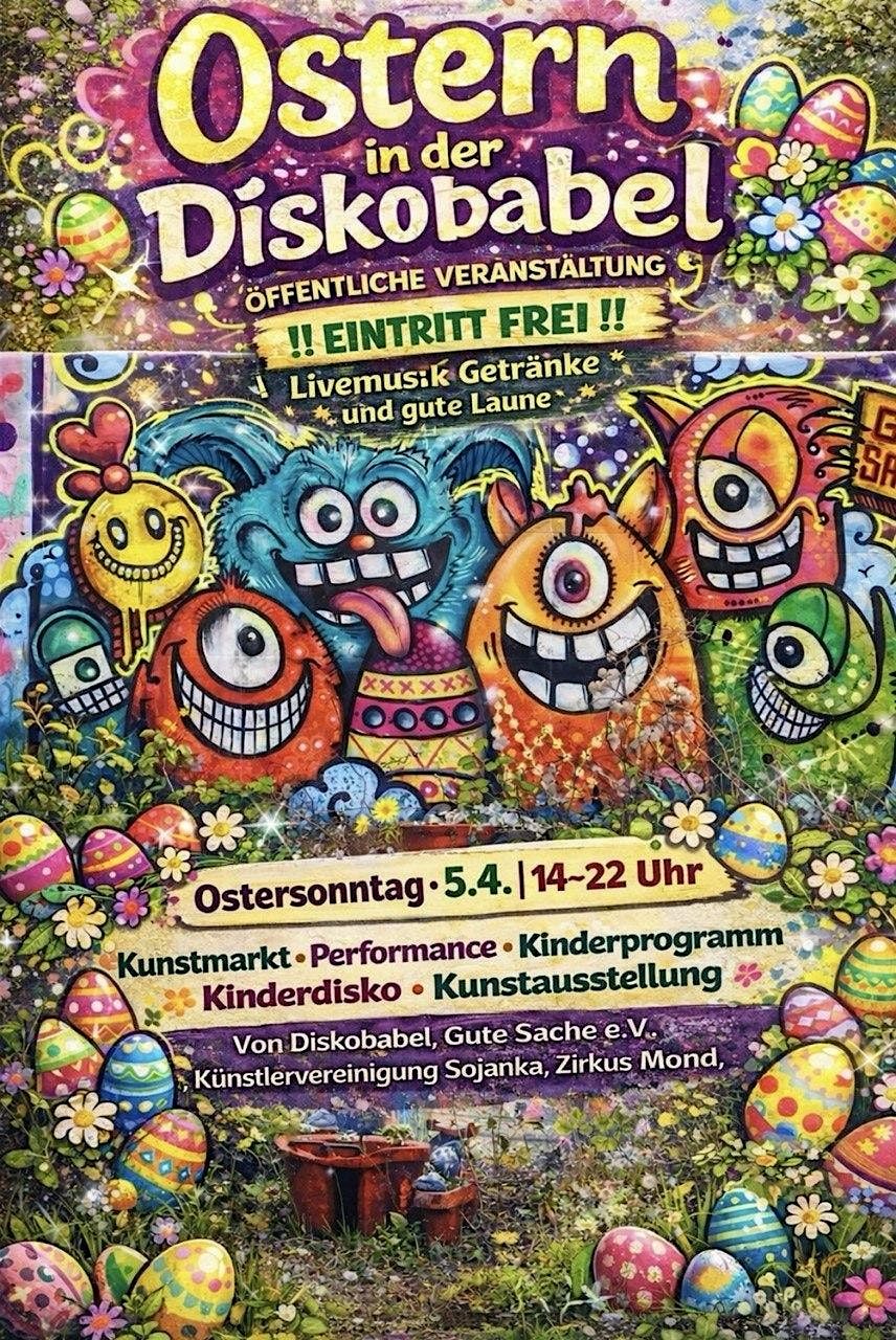 Der Gute Sache e.V. meldet sich pünktlich zu Ostern zurück und hat euch was im Nest versteckt! – Und zwar starten wir, gemeinsam mit dem Zirkus Mond und der Künstlervereinigung Soljanka, in der diskoBabel, in die neue Saison. Das Ganze mit geilem Schnick-Schnack aufm Kunstmarkt, Live Musik, Zirkusvorstellung, Speis & Trank, Ausstellung und noch viel mehr. Natürlich gibt’s speziell für unsere kleinen Gäste auch hier und da versteckte Überraschungen zu finden.