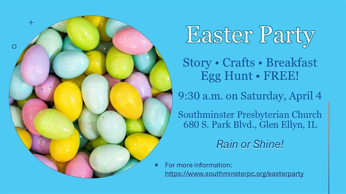 Join us at Southminster Presbyterian Church on April 4, 2026 at 9:30 AM (Central Time) for a fun-filled Easter celebration! We'll have an exciting egg hunt, creative crafts, a tasty breakfast, and an interactive, walk-through Easter story. Bring your family and enjoy a morning of laughter and joy. Don't miss out on the fun! For more information: www.southminsterpc.org/easterparty