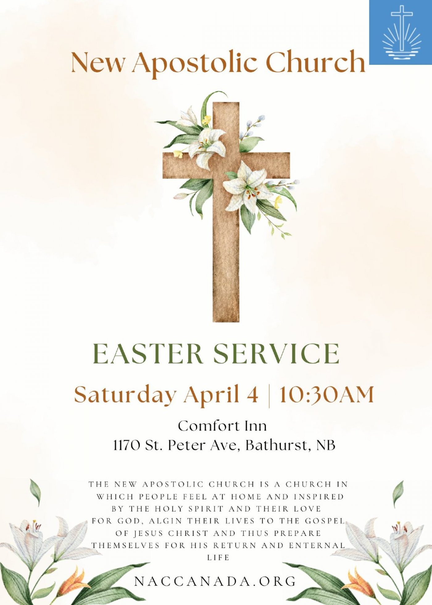 The New Apostolic Church is having an Easter service on Saturday April 4 at 10:30 am.