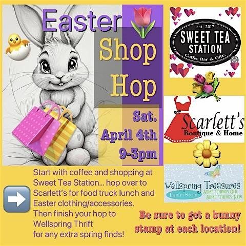 What is an Easter Shop Hop? Join us for a day of shopping adventures! Start you hop at Sweet Tea Station with one of their delicious coffee creations and maybe something sweet. Shop their specials, get your card stamped and travel back up Reidville Road to Scarlett's Boutique & Home. At Scarlett's you can shop with our 15 in-house vendors. You'll find new boutique clothing and accessories, handmade items such as candles, wooden bowls and trays, signs, crochet items, and more. We also have repurposed furniture and home decor, gifts, collectibles and women's consignment. JS Concessions will be at Scarlett's just in time for a lunch snack. Get your card stamped at Scarlett's before heading on down Reidville Road to Wellspring Treasures Non-Profit Thrift Store. You'll find all types of unique items, from home decor, to clothing and accessories. Wellspring Treasures supports our local needs through donations from the community. Ask how you can give back to the community while you shop. Finally, get your card stamped at Wellsprings. Bring your fully stamped card back to Scarlett's Boutique & Home within 7 days to be entered into a drawing for a $100 Gift Card from Scarlett's. A fully stamped card can also be used to get 20% off your purchase at Scarlett's during this event.