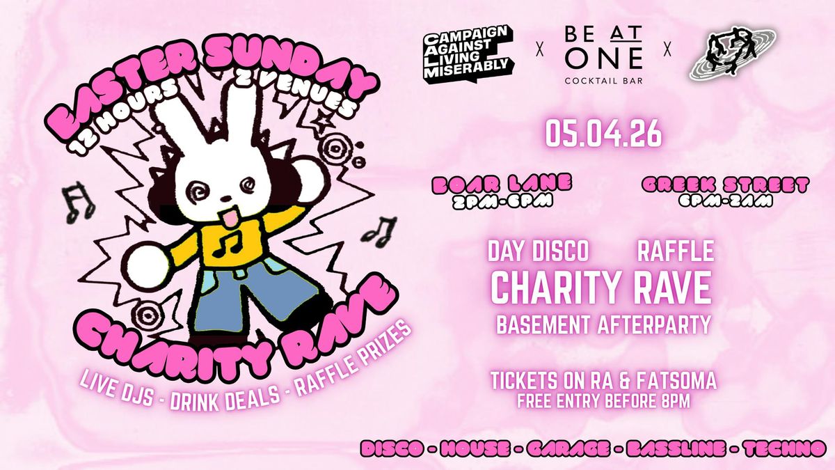 12 hours. 2 venues. 1 important cause🐣🪩On Sunday 5th April, Be At One Leeds and Based Collective are linking up for a 12 hour charity ‘rave-a-thon’ raising money for Campaign Against Living Miserably (CALM)💚