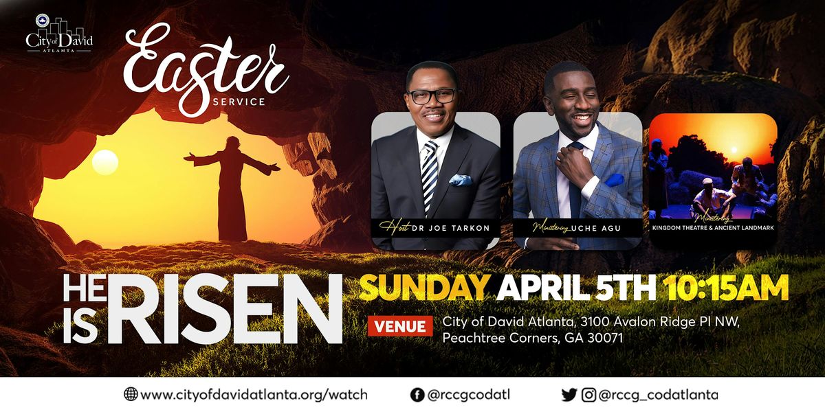 Easter Service — He Is Risen 📅 Sunday, April 5th 🕥 10:15 AM EST 📍 RCCG City of David Atlanta — 3100 Avalon Ridge PL NW, Peachtree Corners, GA 30071 💻 Live stream: https://www.youtube.com/@cityofdavidatlanta