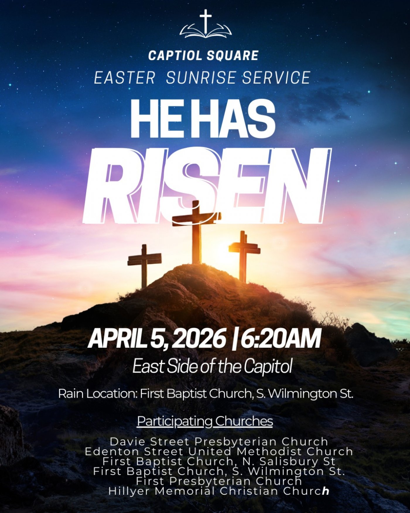 Before you and your family hunt for multi-color eggs Easter Sunday, please join clergy from six downtown Raleigh Churches for a multi denominational Sunrise Service filled with an inspirational message, beautiful music and fellowship. There is just something about arriving in darkness and leaving in the light that sets the tone for a wonderful Easter. You bring the lawn chairs... We'll bring the coffee!