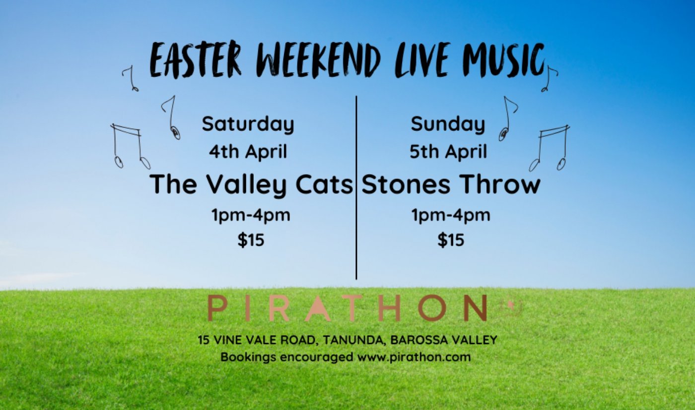 Hop into Pirathon this Easter with live music on Saturday AND Sunday!Pirathon Cellar Door in the heart of the Barossa Valley comes alive this Easter with the sound of local music both Saturday AND Sunday, while offering an unforgettable weekend of great wine, food, and relaxed vibes.
