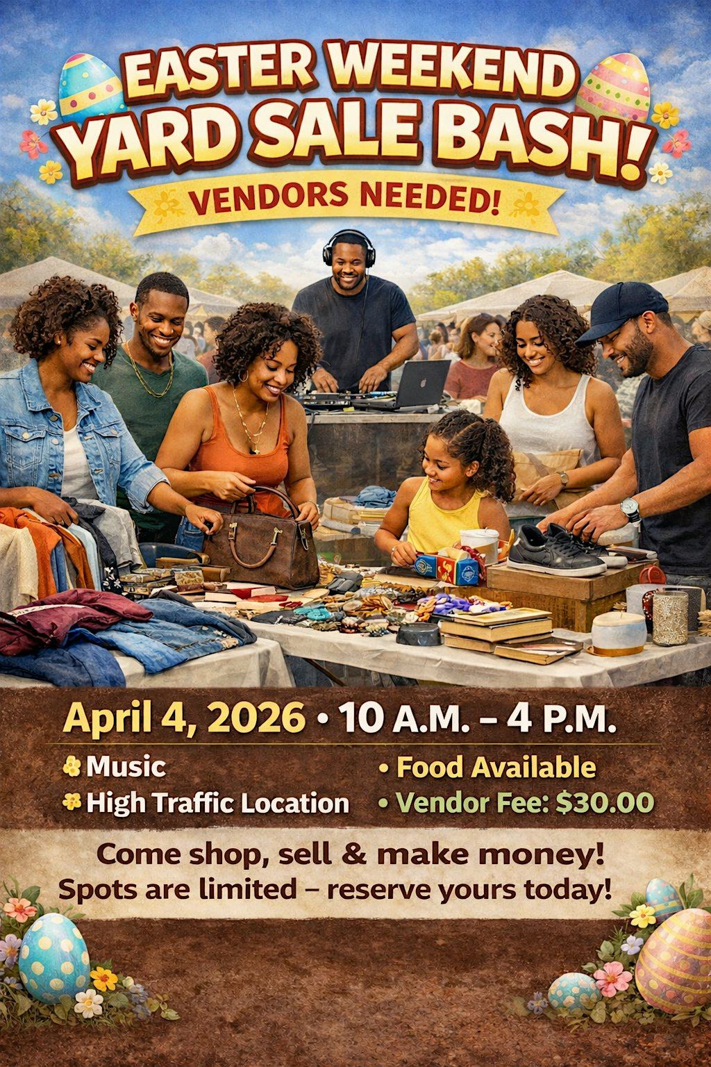 Join us for an exciting Easter Weekend Yard Sale Bash happening on April 4, 2026, from 10:00 A.M. to 4:00 P.M.! This is the perfect opportunity for vendors, small business owners, and entrepreneurs to showcase their products, connect with the community, and make great sales in a high-traffic environment.