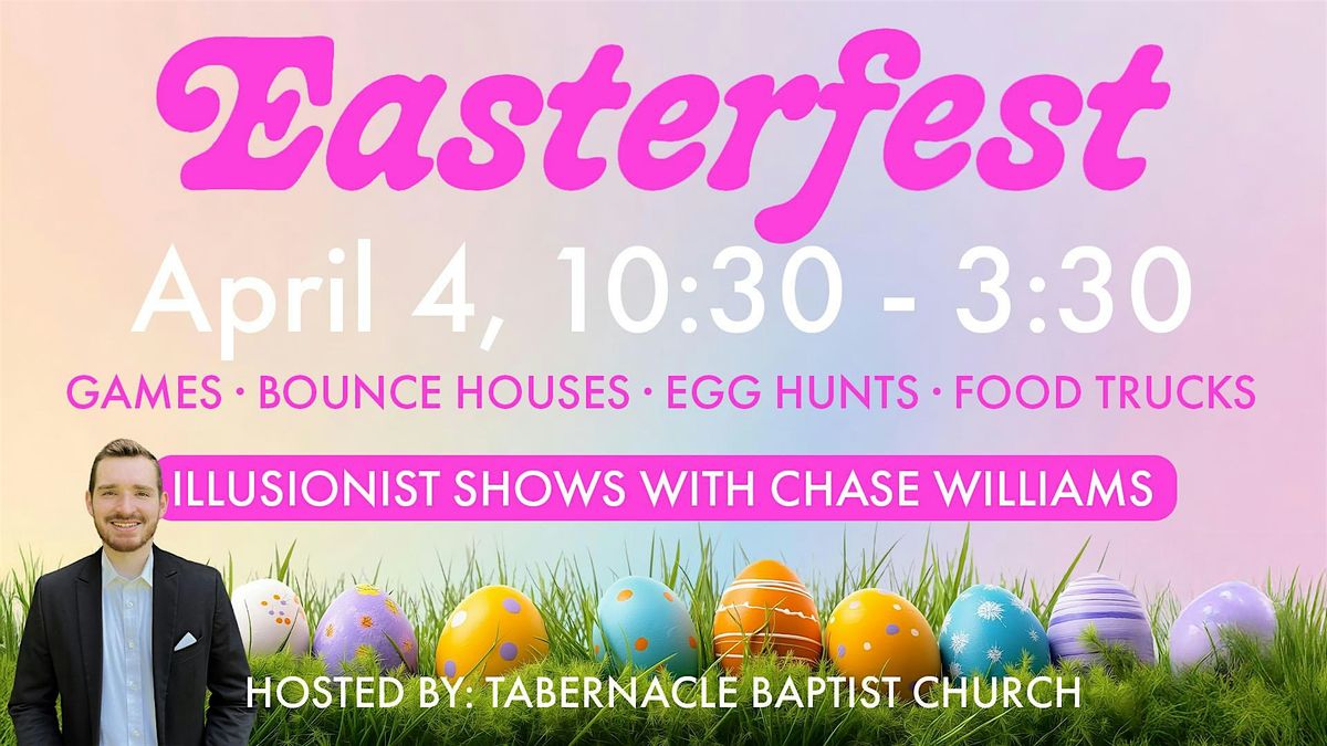 Come join us at Tabernacle Baptist Church for a fun-filled day of Easter festivities with 10,000 eggs! There will be games and activities for the whole family, food trucks and vendors, opportunities to have your picture taken with the Easter Bunny, egg hunts, and illusionist shows by Chase Williams, where two lucky people will win a golden ticket for an all-expenses-paid trip to Kings Dominion for their family (up to $200 value each).