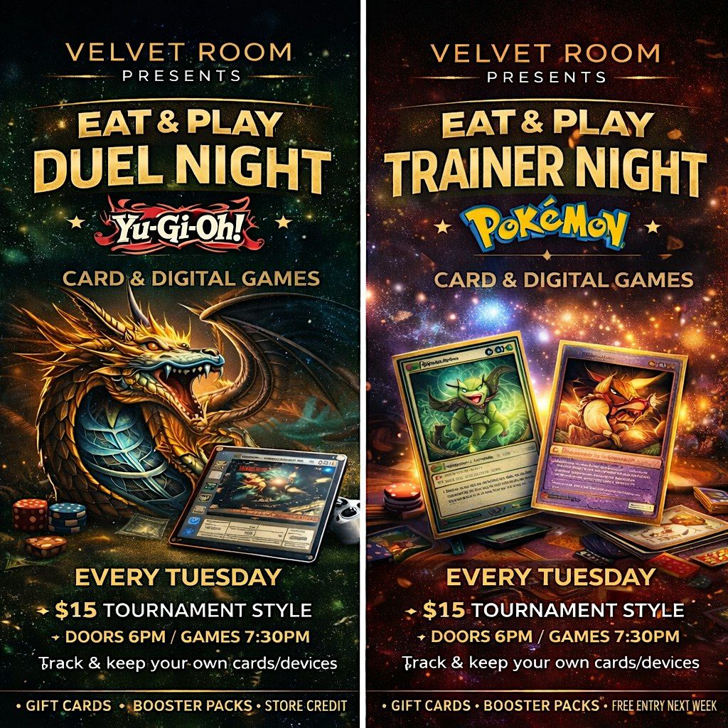 Velvet Room presents Eat & Play Tuesdays — a weekly gathering for card game fans and digital duelers.