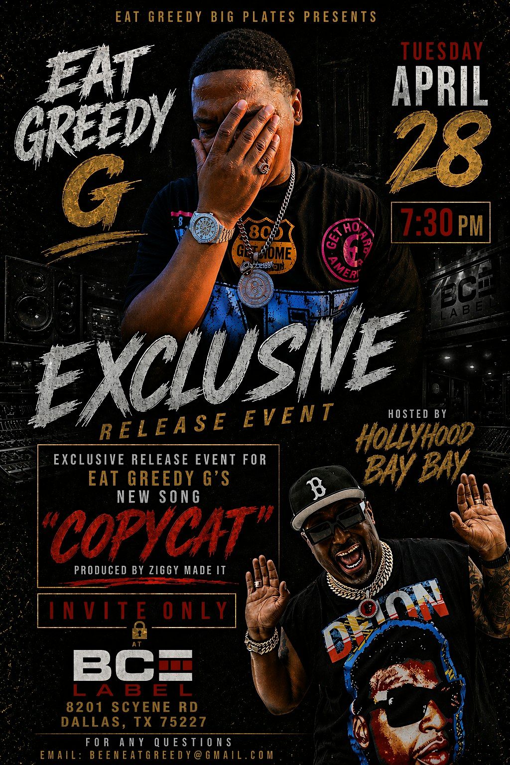 This is an exclusive, invite-only first listen for Eat Greedy G’s upcoming single, “Copycat” (produced by Ziggy Made It).