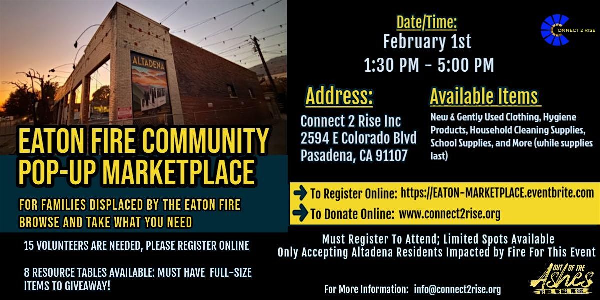 Join us for a Community Pop-Up Marketplace thoughtfully organized for Eaton Fire survivors—more than just a distribution event, this is a gathering where shared strength meets practical support and genuine connection.