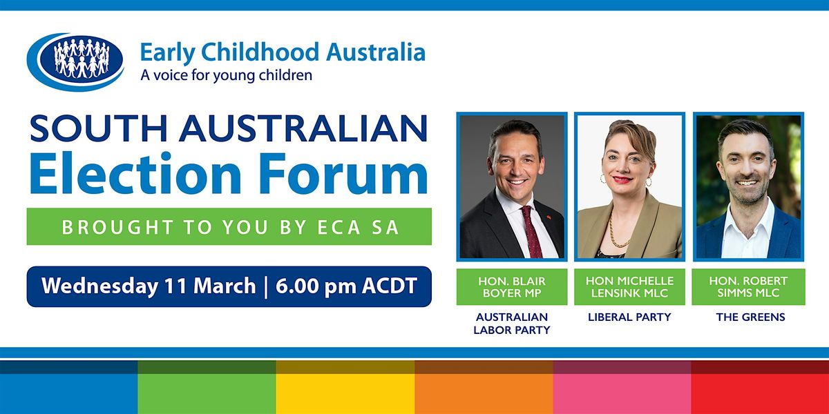 This forum is an opportunity to hear directly from participating candidates about their priorities for children, families and early childhood education and care in South Australia. Each candidate will provide a brief overview of the policy positions of their parties, followed by a moderated discussion led by ECA CEO, Samantha Page.