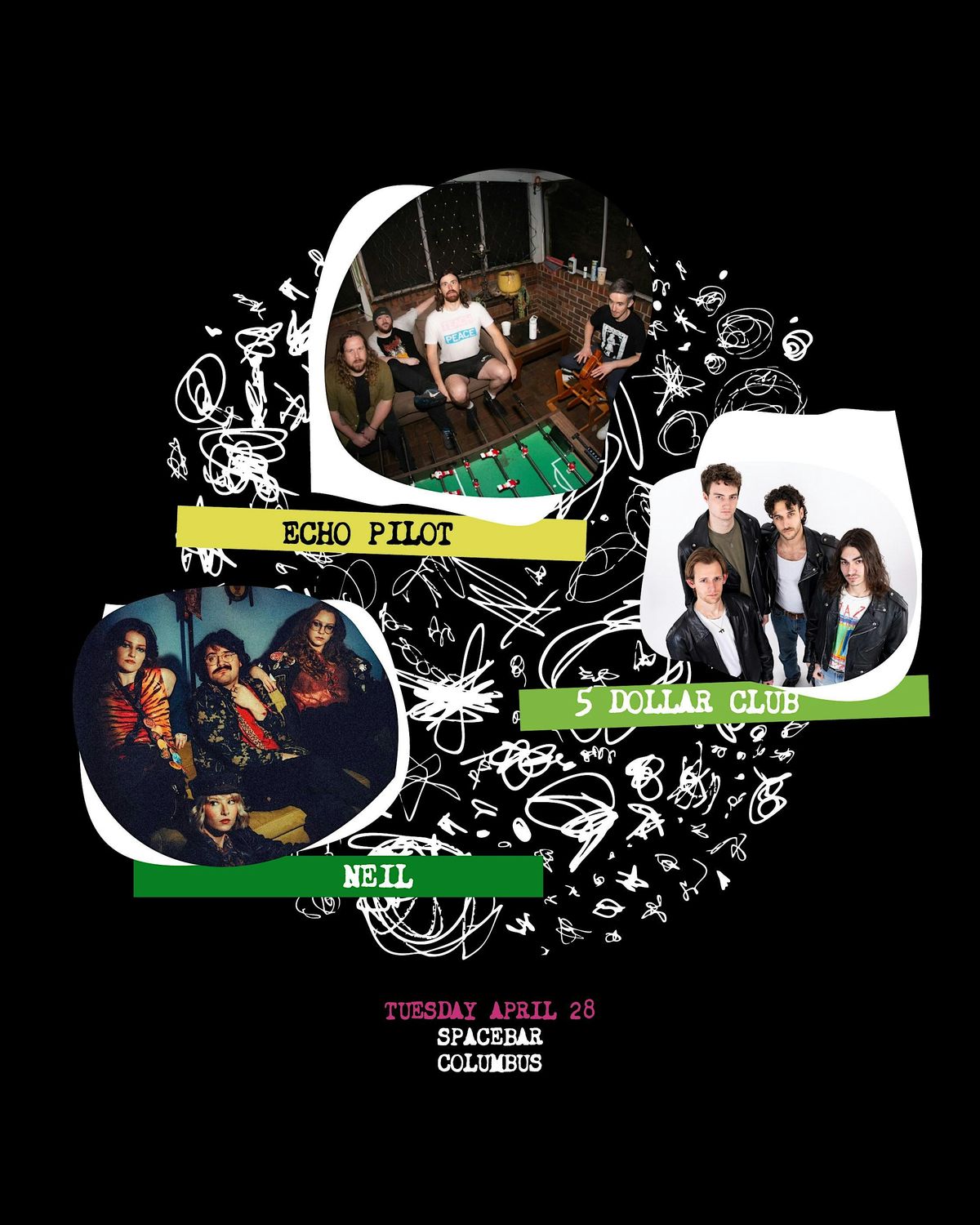Echo Pilot, 5 Dollar Club, NEIL @ Spacebar 4/28 - 2590 N High St, Columbus OH - 7pm Doors, $10/$15, 18+About this Event