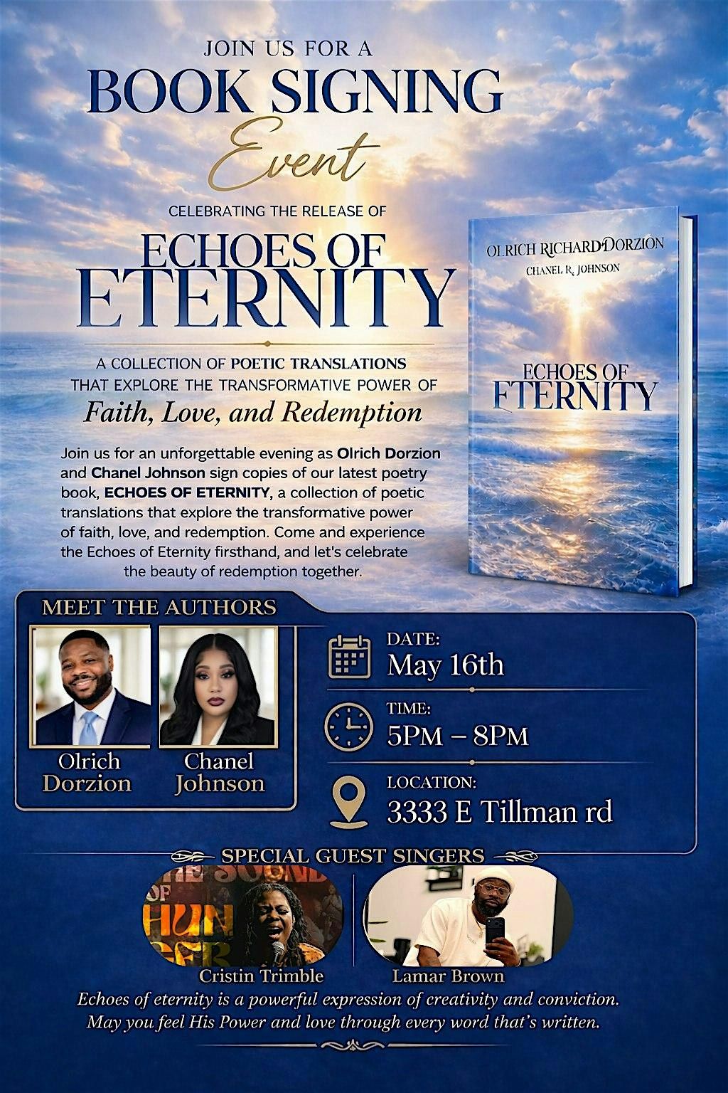 Info: "There will be books available for purchase, and we will be signing them between 6 and 7 PM. You will also be able to take photos with the authors. Enjoy the evening with live music and a thank-you treat on the way out."