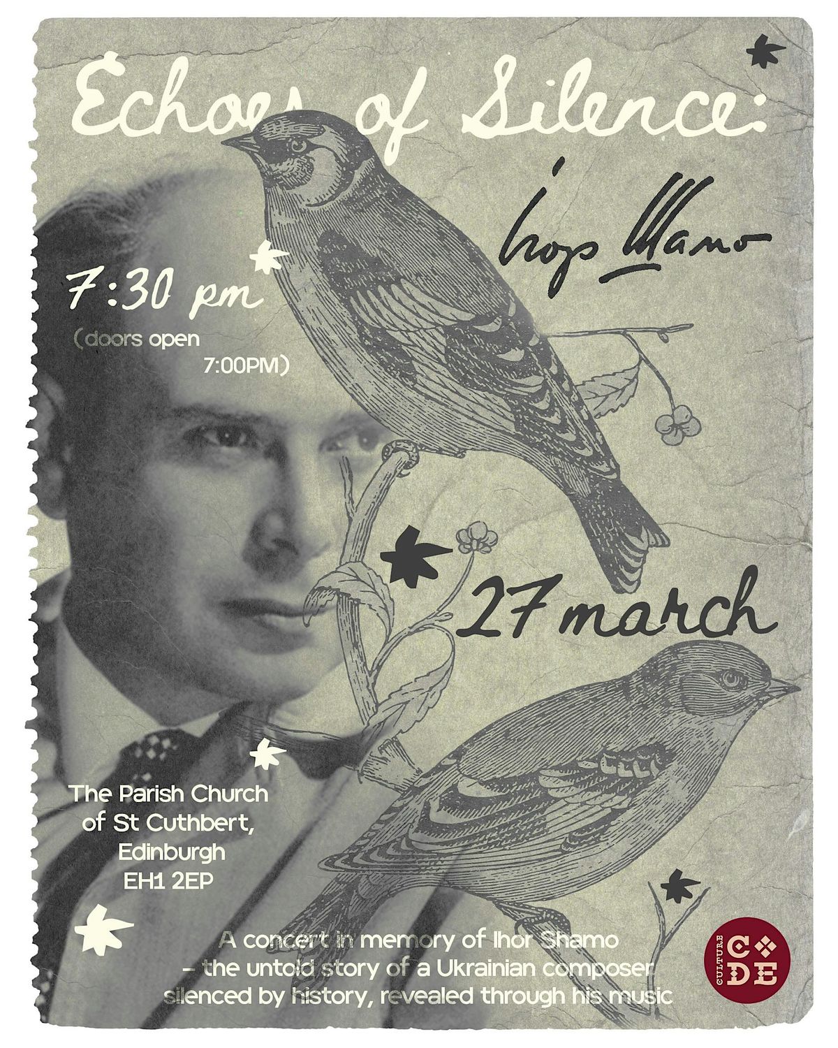 This concert is dedicated to the 100th anniversary of Ihor Shamo – a remarkable Ukrainian composer, whose lyrical genius was overshadowed for decades by censorship and politics.The programme will include Shamo’s Symphony for Strings, Flute Concerto, Aria from the Accordion Concerto, and songs arranged for string orchestra and voice – performed by the Culture Code Orchestra, with guest soloists including Sofia Ros (BBC Young Musician 2025, accordion) and Valeria (flute).