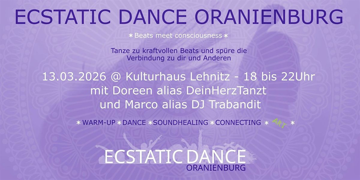 Am 13.03.2026 wird es ein weiteres Mal einen Ecstatic Dance in Oranienburg geben. Nach 5 aufregenden Events in den letzten Monaten, tanzen wir wieder im Kulturhaus Lehnitz. Diesmal mit einem Warm-up vorher und einem Soundhealing mit Klanginstrumenten zur Integration.
