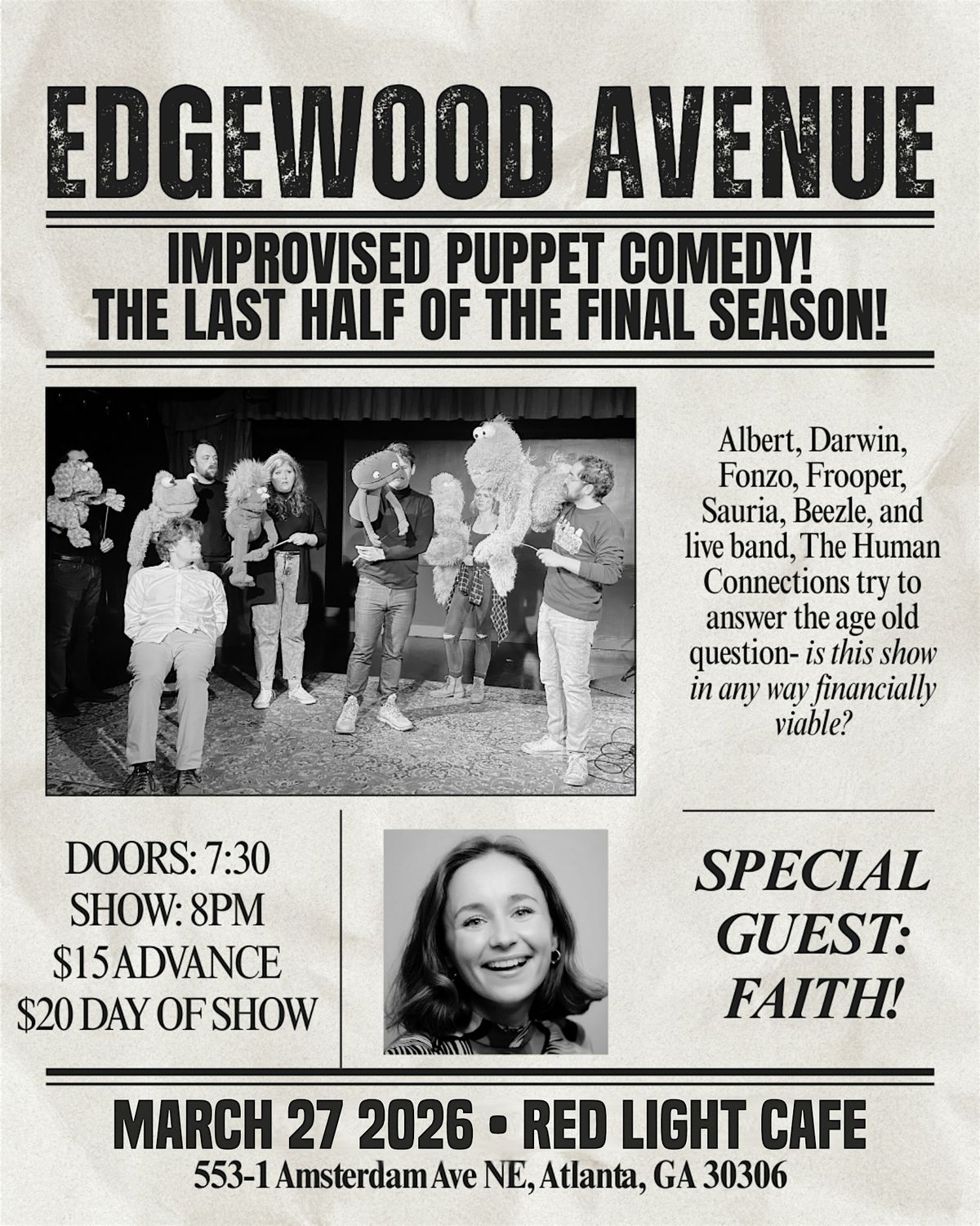 Edgewood Avenue is an improvised variety show featuring a mix of digital, musical, scripted, and improvised elements performed by a cast of puppets. Join Albert, Beezle, Darwin, Fonzo, Frooper, & Sauria as they navigate through the holiday season & finding the best presents…friendship! Alongside as always the incredible live band The Human Connections & special guest host!