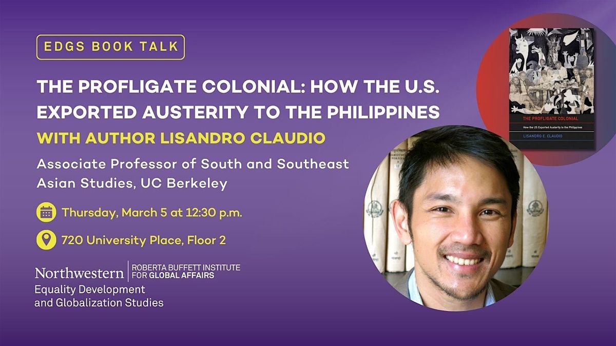 Join the Roberta Buffett Institute's Equality Development and Globalization Studies (EDGS) Program for a book talk with Lisandro E. Claudio, Associate Professor of South and Southeast Asian Studies at the University of California, Berkeley and author of , a look at how austerity, long before it became a buzzword of modern technocracy, was a tool of US empire. Claudio argues that this orthodoxy is in fact a colonial inheritance—a legacy of American rule that cast Filipinos as reckless spenders and imposed monetary discipline as a civilizing force. At the center of this logic is the "profligate colonial," a feminized, racialized figure who wastes public funds and so requires the steady hand of imperial governance.