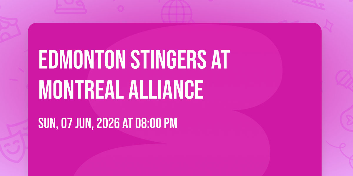 📍 Location: 45.4629, -73.5616🎉 Welcome to Edmonton Stingers at Montreal Alliance, where dreams come alive and possibilities are endless! 🏛️ Join us at Verdun Auditorium in the heart of Verdun, QC for an event that defies expectations. 📅 On June 7th, 2026 at 08:00 PM, be part of something truly extraordinary as we bring together innovation, entertainment, and pure magic. ✨ Every aspect has been carefully designed to ensure an unforgettable experience for all our guests. Whether you're seeking adventure, inspiration, or simply a break from the ordinary, this event promises to deliver beyond your wildest dreams. 🎊 Prepare for a journey into the extraordinary!