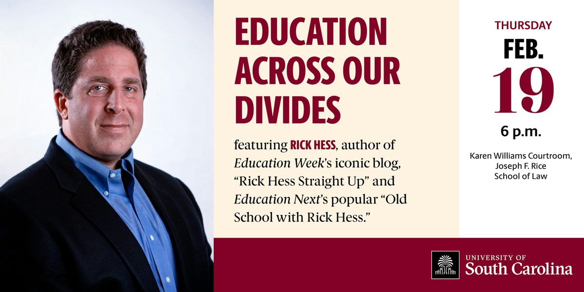 We are pleased to welcome Rick Hess for an evening discussion on February 19 at 6 p.m. in the Karen J. Williams Courtroom at the Joseph F. Rice School of Law. Hess is the author of Education Week’s iconic blog “Rick Hess Straight Up” and Education Next’s popular series “Old School with Rick Hess.”