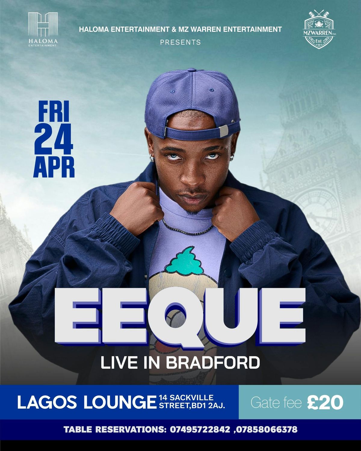 Bradford, Yorkshire β Get ready to feel the rhythm of South African as the King of Amapiano, Eeque, brings his signature sound and high-energy performance to Lagos Lounge Bradford on April 24, 2026.Whether you are a die-hard Amapiano fan or looking for the biggest party in Yorkshire, this is an event you cannot afford to miss. Experience the bass, the vibes, and the royalty of the genre live in the heart of Bradford.