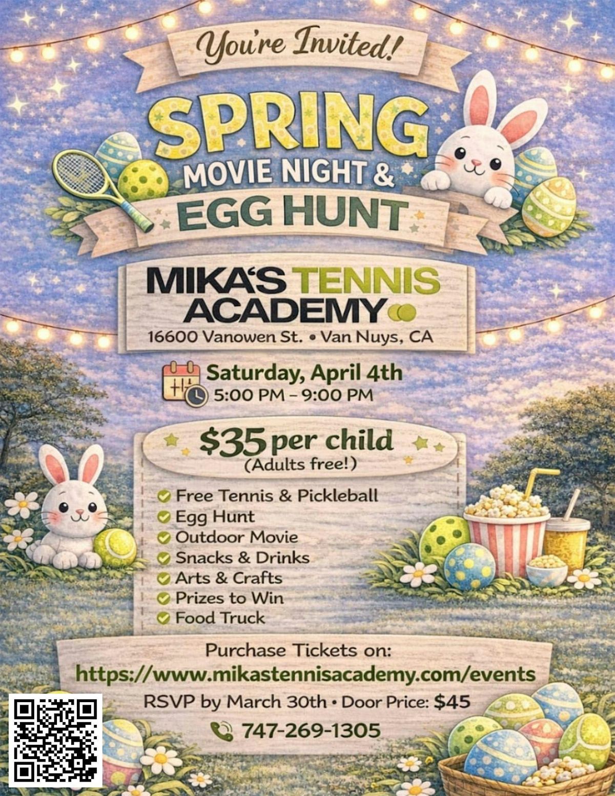 Join us at Mikas Tennis Academy for a Spring Movie Night & Egg Hunt โ a fun-filled, family-friendly evening designed for connection, play, and unforgettable memories.